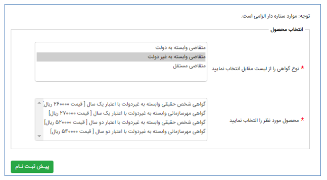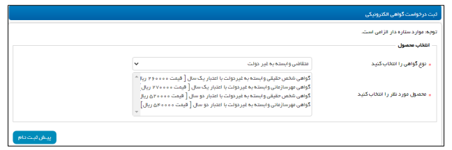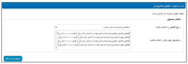 در این مثال نوع گواهی »متقاضی وابسته به غیر دولت« و محصول »گواهی شخص حقیقی وابسته به غیر دولت« با اعتبار یک سال یا دو سال