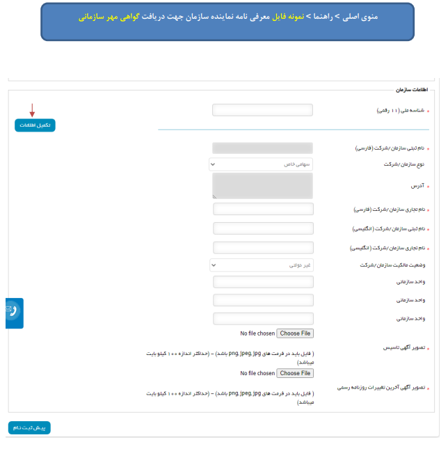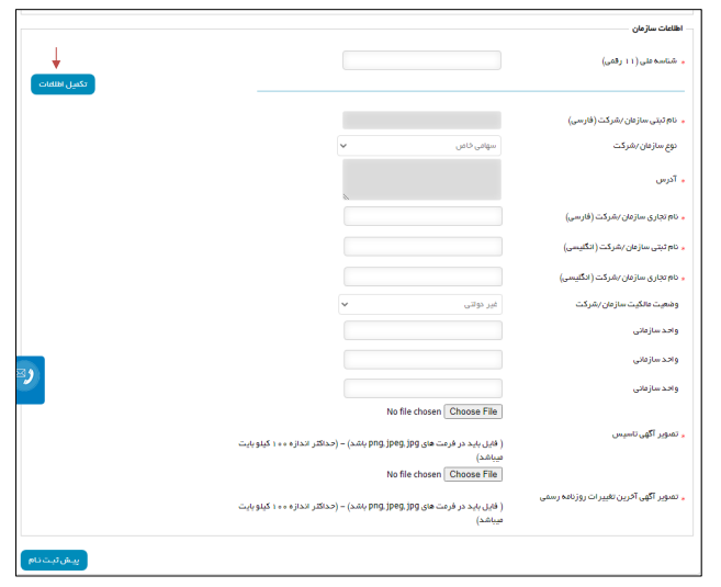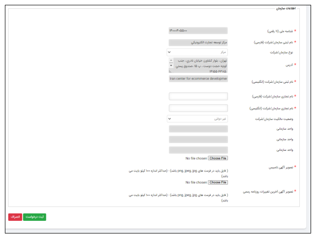 • فیلدهای نام ثبتی سازمان، نوع سازمان و آدرس به صورت خودکار بارگزاری می شود.