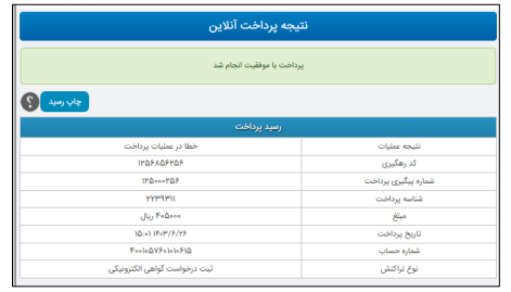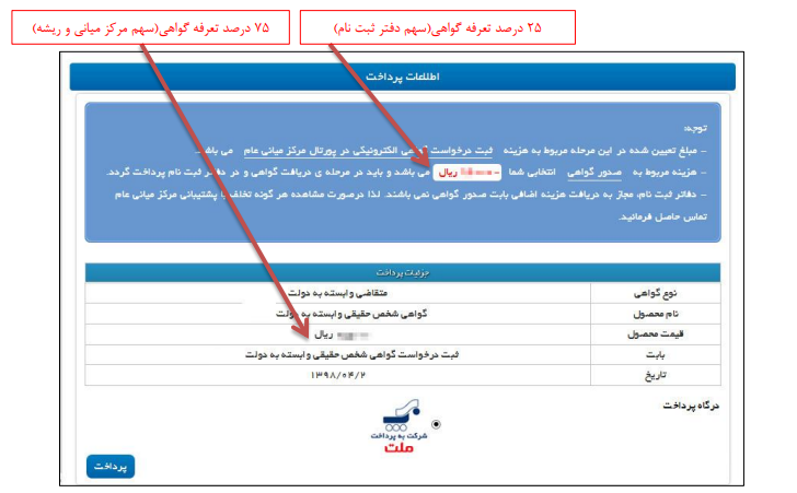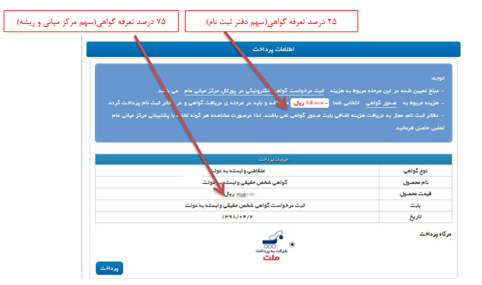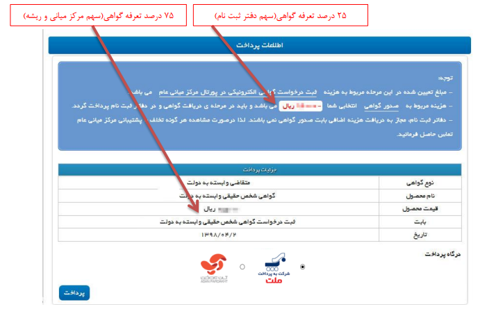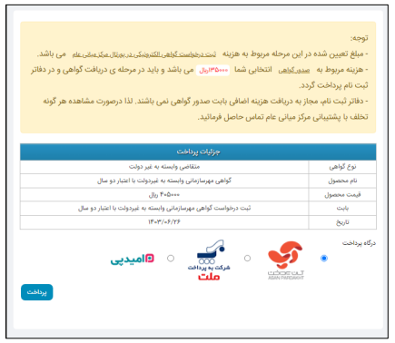 در این مرحله صفحه پرداخت تعرفه گواهی الکترونیکی نمایش داده می شود.