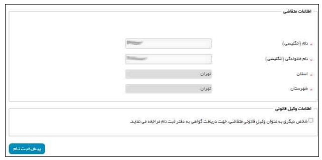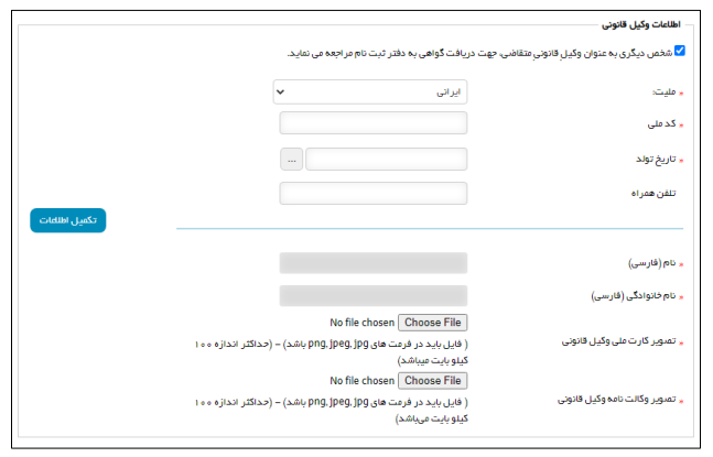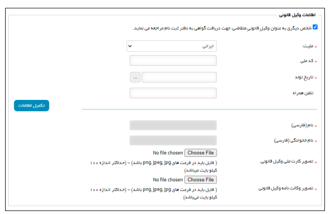در صورتیکه گزینه وکیل قانونی را انتخاب نمایید به این معنی می باشد که متقاضی گواهی امکان حضور در دفتر ثبت نام را نداشته و به شخص دیگری