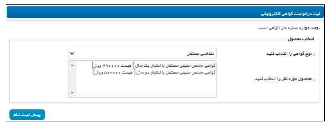 در این مثال نوع گواهی »متقاضی مستقل« و محصول »گواهی شخص حقیقی مستقل« با اعتبار یک سال یا دو سال را انتخاب نمایید.