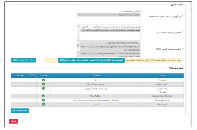 نتایج بررسی CSR در ادامه فرم نمایش داده خواهد شد در صورتیکه که مقادیر CSR صحیح باشد وضعیت تمامی فیلدها با تیک سبز نشان