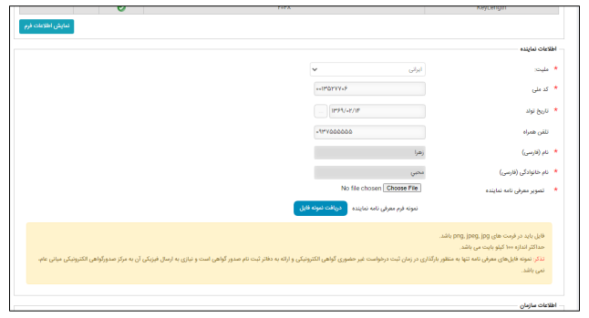 معرفی نامه نماینده را مطابق با نمونه فرم بخش »راهنما«، تکمیل و بارگذاری نمایید.