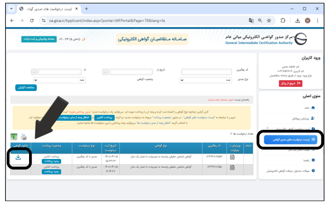 صدور گواهی را انتخاب و گواهی صادر شده را دانلود نمایید.
